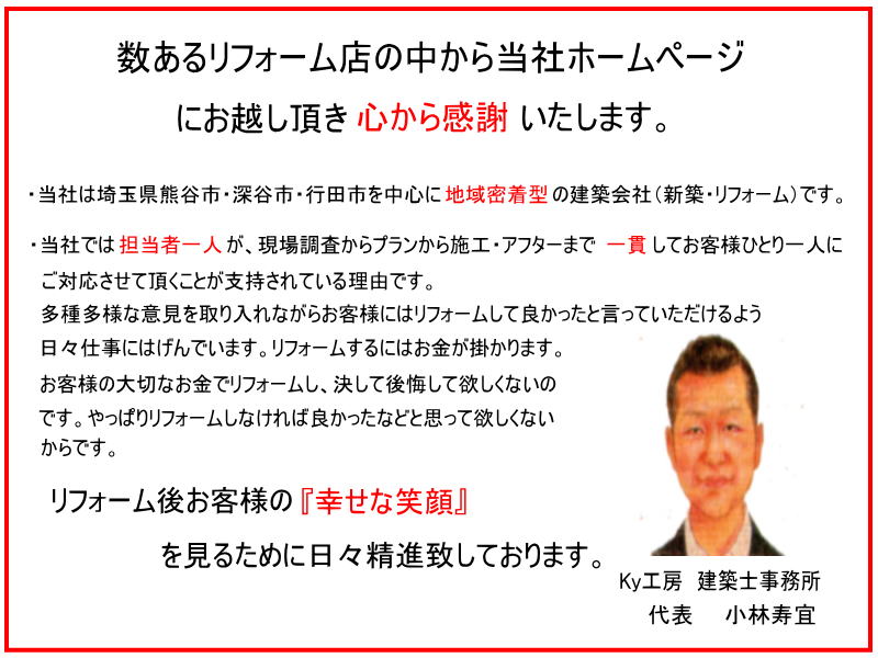 永くお付き合いしたい大切なお客様だからこそ良い部材・材料を使い、この金額でこんな良いリフォーム工事ができたと思ってほしいのです。そのためにKy工房では、厳選した部材・材料でコストパフォーマンスに優れた良い家ずくりを提供しています。